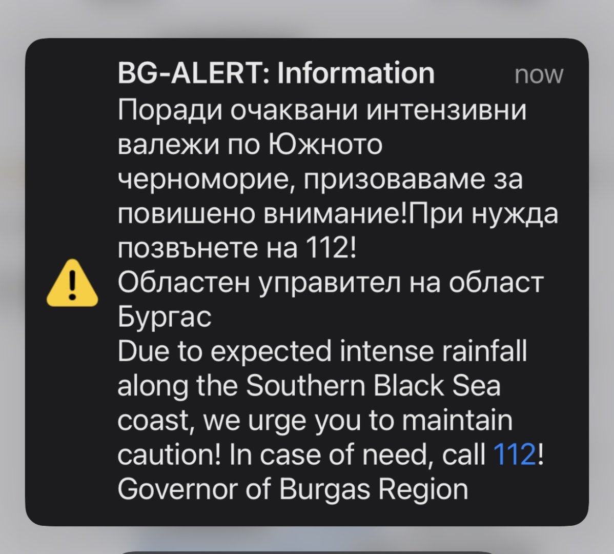 телефони на жителите на Бургас получиха спешно известие от националната система BG-ALERT, подписано от Областния управител на област Бургас.
