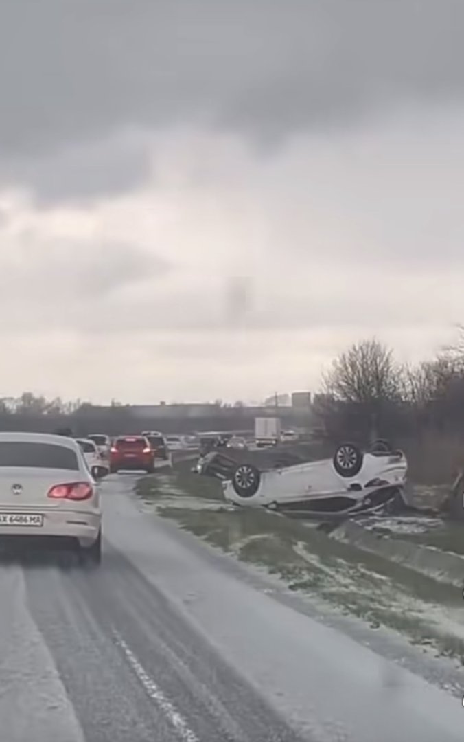 Причината е ясна – несъобразена скорост върху заледената настилка. При температура около 8 градуса и интензивна градушка, асфалтът става хлъзгав като лед.