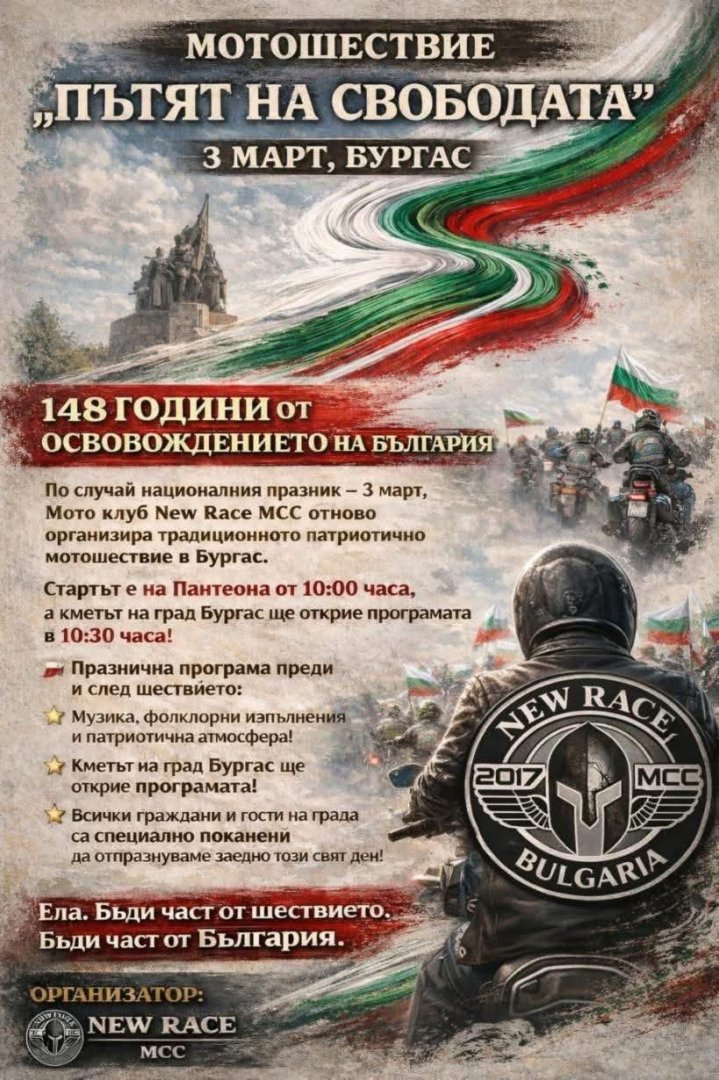 Националният празник на България – 3 март – отново ще бъде отбелязан в Бургас с традиционното мотошествие „Пътят на свободата“, организирано от мото клуб New Race MCC. И тази година инициативата обединява мото общността, родолюбци и всички, които искат да бъдат част от общ празник, посветен на 148 години от Освобождението на България.