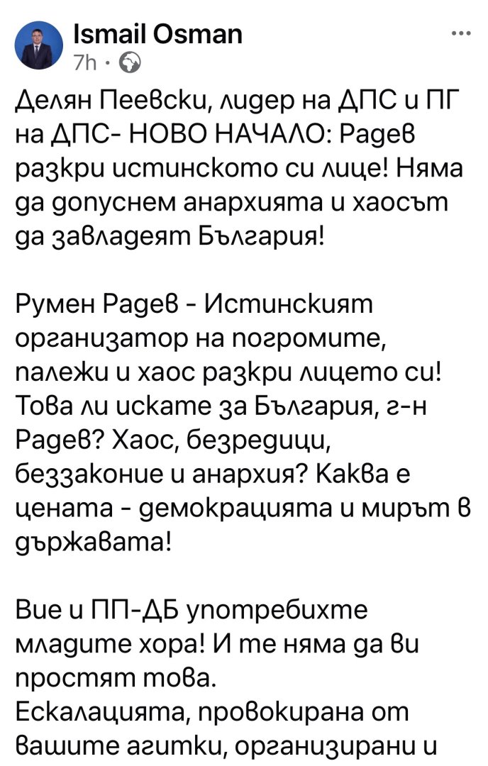 Делян Пеевски и ДПС очевидно продължават да живеят в паралелна реалност, в която протестите не са обществен сигнал, а „погроми“, „организирани от Радев“, „олигарси“, „агитки“ и каквото друго звучи удобно за отклоняване на вниманието. Новата тирада, споделена от Исмаил Осман, е от същата серия – драматични обвинения, истерия за „хаос“ и „анархия“, и нито ред за истинския проблем: хората просто не искат Пеевски в политиката. Толкова е просто.