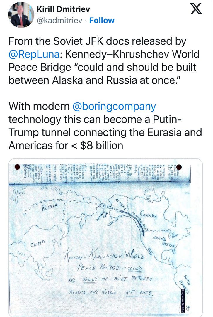 Дмитриев допълва, че с модерните технологии на компанията The Boring Company на Илон Мъск, идеята може да се възроди под нова форма – като „Путин–Тръмп тунел“, свързващ Евразия и Америка за по-малко от 8 милиарда долара.