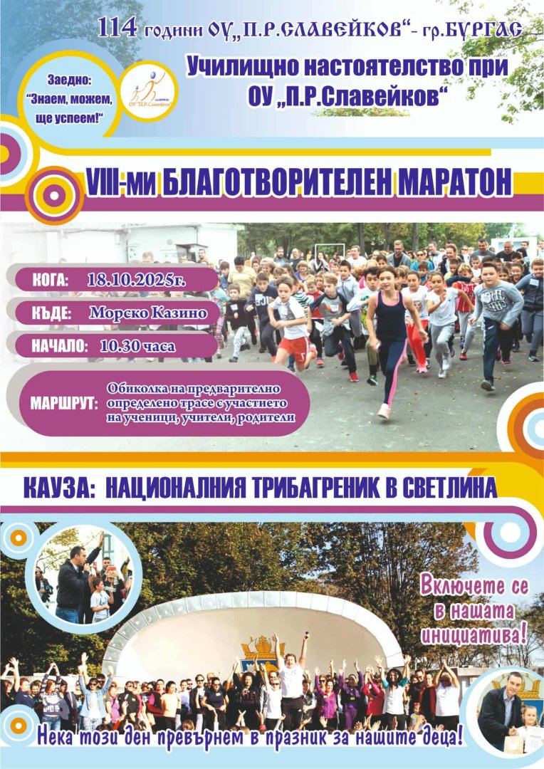 Тази събота, 18 октомври 2025 г., от 10:30 часа пред Морското казино ще се проведе осмото издание на благотворителния маратон на ОУ „Петко Р. Славейков“ – Бургас. Събитието вече се е превърнало в традиция, която обединява ученици, учители и родители в дух на спорт, патриотизъм и общност.