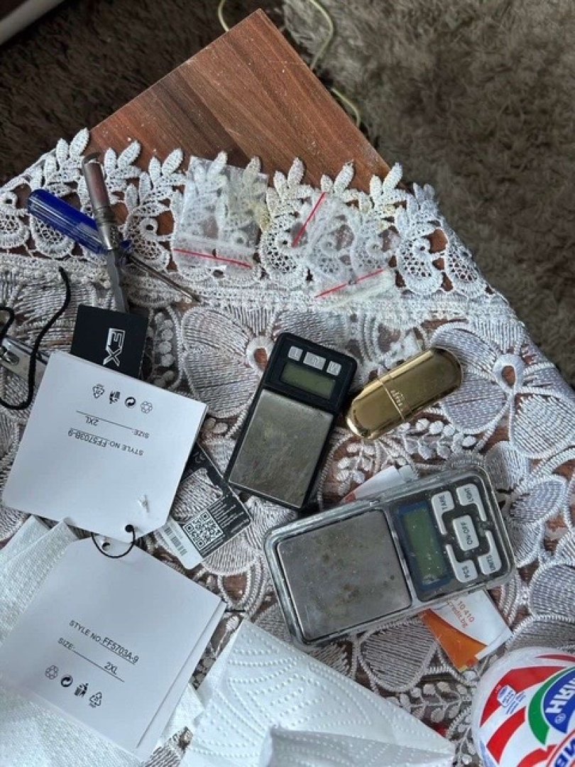 В раница, намерена в имота, са открити електронна везна, сиви гранули, червено прахообразно вещество, четири свивки с кристалообразно съдържание, контейнер с надпис „сода на люспи“, стъклена колба с вместимост 500 мл и други предмети, използвани при обработка и смесване на субстанции. Допълнително са иззети още две електронни везни и плик с бяло прахообразно вещество с тегло около 100 грама.
